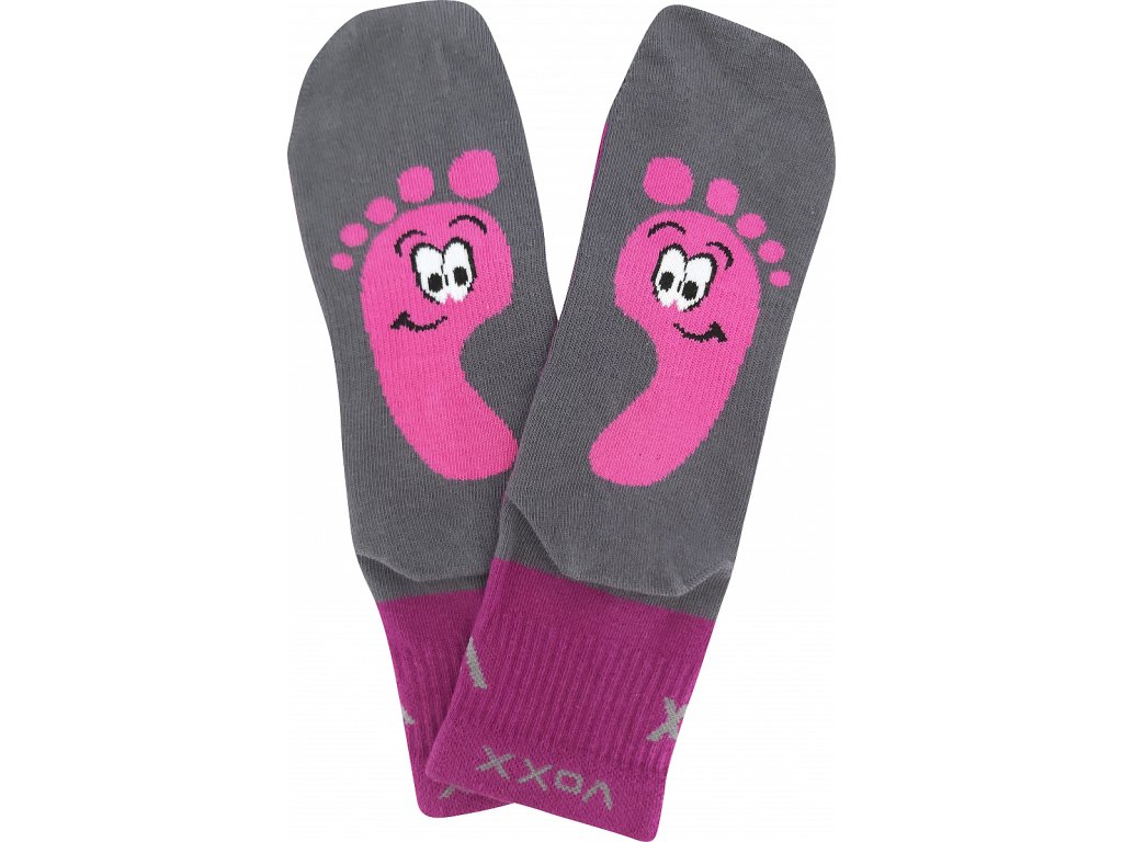 Dětské ponožky BAREFOOTIK jsou pohodlné, slabé ponožky ze sportovní kolekce VoXX®. Mají jedinečný ergonomický tvar, který se maximálně přizpůsobí noze. Široká prstová část a anatomické tvarování na levou a pravou nohu předurčují ponožky pro nošení v barefootové obuvi! Špička ponožky je uzavřena náročnějším řetízkováním, proto je spoj dokonale hladký a nehrozí, že ponožka bude tlačit. Ponožky mají teplotní třídu A, tyto tenké ponožky jsou ideální na nošení po celý den v teplotách od +10°C do +35°C. Díky obrázku na chodidle si vaše děti už nespletou, na kterou nohu ponožka patří.
